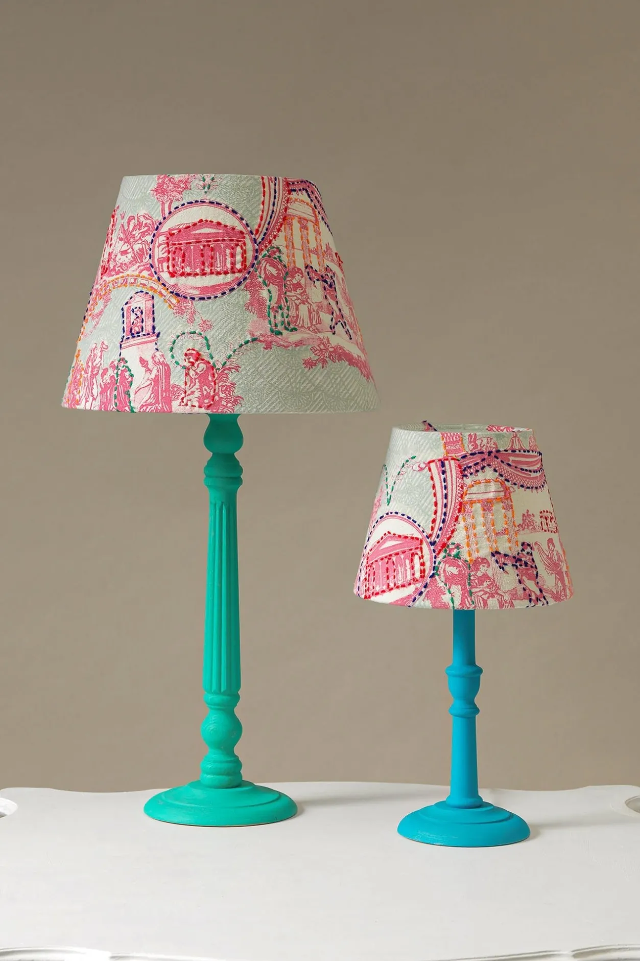 The Ancient Columns Print Is Inspired By Classic Pink And White French Toile De Jouy Fabrics But With A Modern Twist. It Features Delicate Sketches And Detailed Scenes Of Ancient Roman And Greek Architecture And Has Hand Embroidered Detailing.